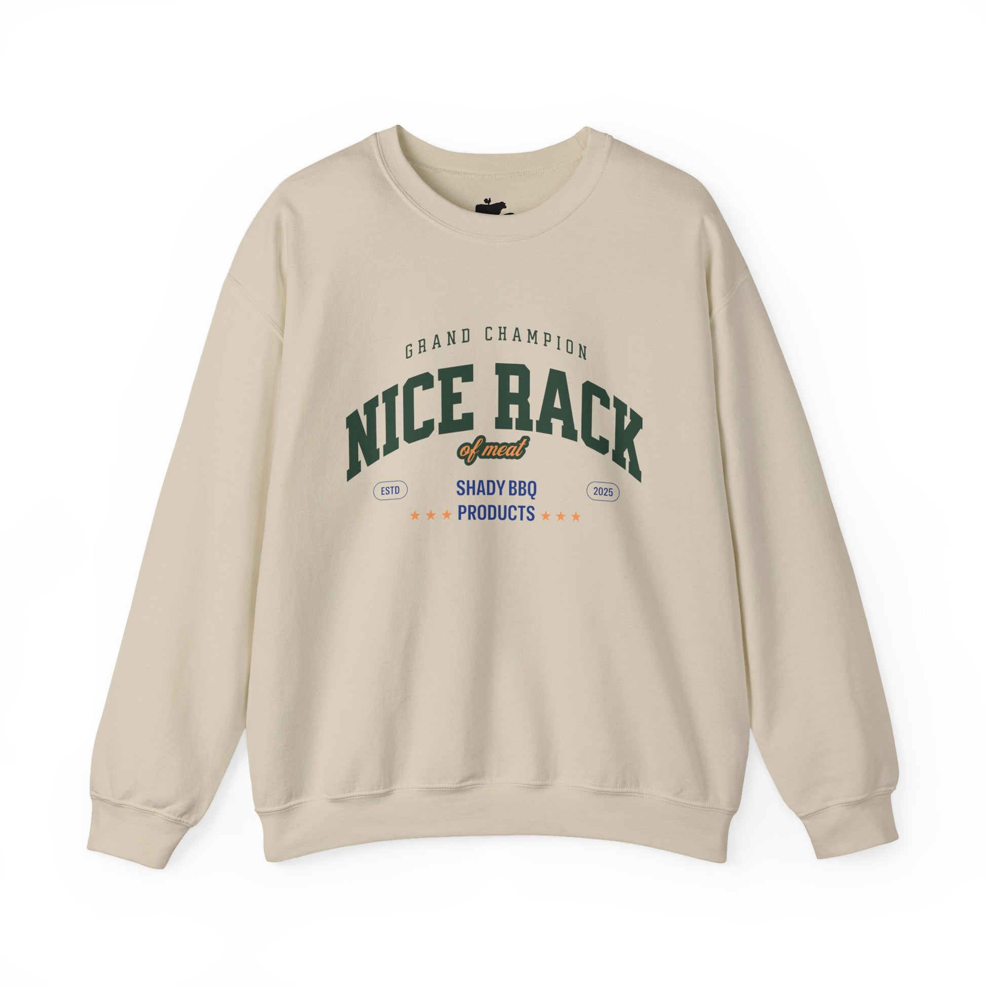 This "Nice Rack of Meat" crewneck turns every cookout into comedy hour. Excellent for manning the smoker at tailgates where your ribs (and jokes) are legendary, weekend BBQ sessions that need a conversation starter, or Father's Day celebrations honoring dads who master both the grill and the punchline. The cozy cotton-poly blend keeps you warm during fall grilling. All while the ribbed collar maintains its shape through countless washes.